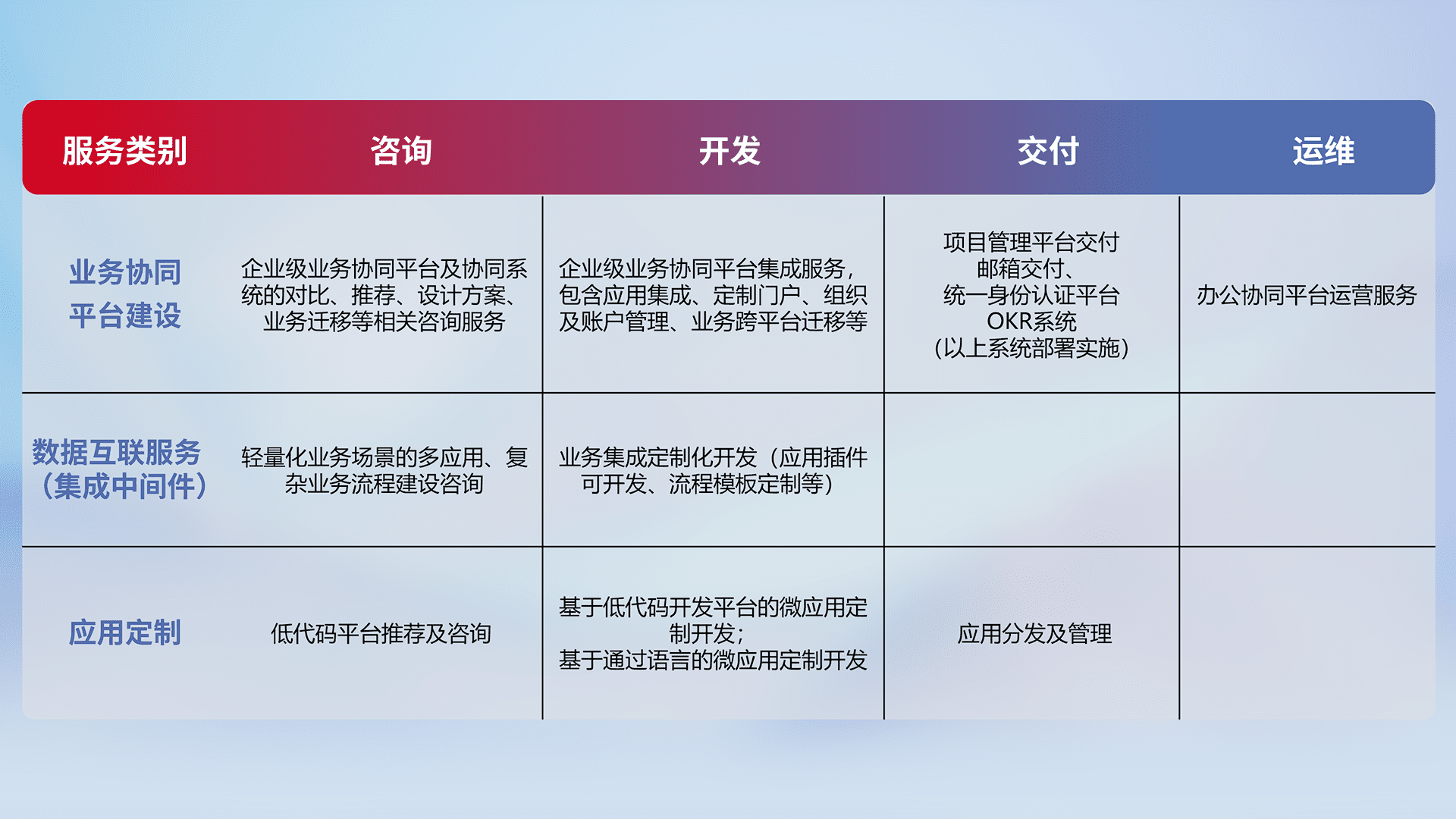 针对钉钉、、企微、、、IDaas等平台级产品提供产品的规划、、、、方案、、、交付、、定制化开发等服务,,,实现如统一协同办公、、、、智能客户服务、、、混合会议管理、、、、智能数据查询、、、、等业务场景,,实现数字化转型。。